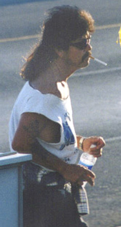 This is the most fierce and dangerous mullet species alive. Do NOT hunt one if you are a beginner, or even a casual mullet hunter...Leave these to us professionals. Like a shark, this is one ferocious predator. Many have weapons, and are looking for any reason to use them. (Fortunately, they tend to only end up hurting themselves.) Physical Predatory Traits to Look for: -Cigarette frozen in the mouth (especially when not lit) -Cut out sleeve/neck shirt exposing faded military tattoos. -Handlebar mustache (a slight variation to the mullestache) -Holding an empty water bottle and leaning against something, creating an intimidating stance. -Ronnie Milsap sunglasses, and attitude Hand musculature has morphed into a strong claw-like grip over many years of evmullution due to habitual cigarette smoking while holding various plastic bottles (see above). -- Note: This right handed specimen appears agitated as the middle digit is slightly flexed, or in a "flipping the bird" position. This usually is a precursor to heavy aggression and blatant cruelty to all animals, big and small. |