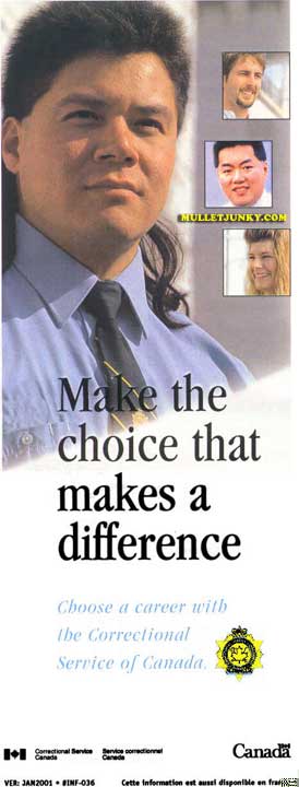 Proof that Canada has embraced the mullet far more than any other country. Really look at this pic, it works on mulltiple levels. On one level it's an obvious ad campaign from the Canadian government to recruit people into the 'Correctional' career.(ahhhh mulls guarding mulls, a hunters paradise) On another level it can be viewed as pro-mullet propaganda. A way of integrating mulls safely back into society, free of prejudices and backlash(Not only is it OK to have a mull but it's actually preferred). We see 3 small pictures of slightly confused coldnecks with insincere smiles on the right...all looking up to one proud, confident, well dressed man with a textbook mull. * Which ever way you interpret this pic one thing is certain....it's an eerie image. |