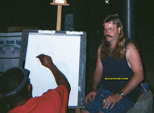 Mullet- Honey, look there's a guy drawing people, should I have him draw me? Wife of Mullet- Sure, see if he can really capture the essence of your mullet meeting you're shoulder/back hair. Mullet- O.K.!, golly, I sure am glad I wore my tank top! Wife of Mullet- . You know, If this Drawing comes out good we can hang it over the mantle next to the singing fish. |