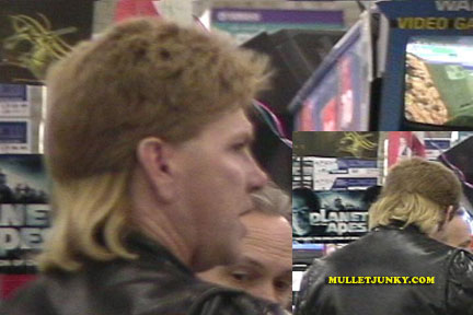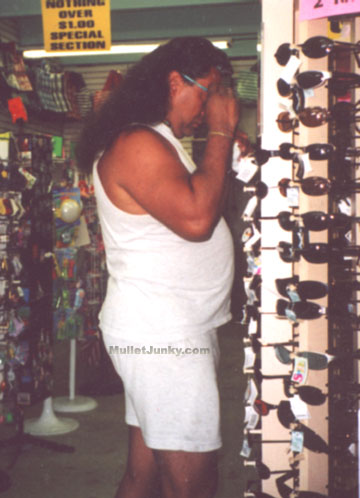 I know it may seem hard to believe but some mullets actually pay attention to the way they look. Here we have an example of some accessorizing from the local gas station. The following is a muttered audio transcript that was stealthily captured: "hmmmm, what glasses will look tight with my mull and white shorts/tank top combo? Thermonuclear Oakley blades thats what will...shit, they don't got em, eh, I'll go with these here with the blue sides, ya, this will work out just fine. Hey look! they've got a dollar section over there, maybe I'll buy my kids a pencil or something. ohhhh I bet they got GOBOTS! I wanna GOBOT!" - * He gets easily side tracked. A mullet in one of those 'quickie mart' type gas stations with all that crap in it is pretty much heaven for allot of mulls. Like a kid in candy store if you will. |