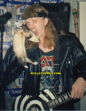 The perfect representation of heavy metull: RATT t-shirt underneath a cropped leather jacket, a black & white circular striped guitar, and empty NATURAL LIGHT 12-pack boxes tacked to the wall. Holding a rodent up to his mouth (insinuating he'd bite off the head) is an act usually coveted by idols(mianly OZZY).