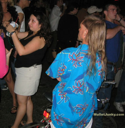 Looks just like a Classic Mullet right? Sweet mullet, Mustache, cheesy yet strangely intimidating sunglasses, etc. The picture below will give you an insight into the true uniqueness of this specimen. Starting with the dog, blindly pulled by a leash attached to a wheelchair. Driving the wheelchair is a Classic Mullet with an image of a joker on his chest. As you can see the mulletude continues to exist even though he is severely immobilized(possible right arm missing). |