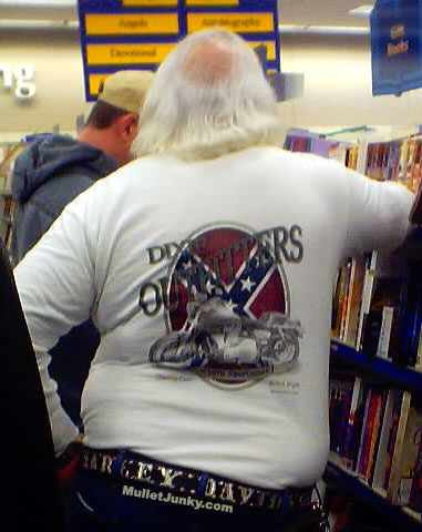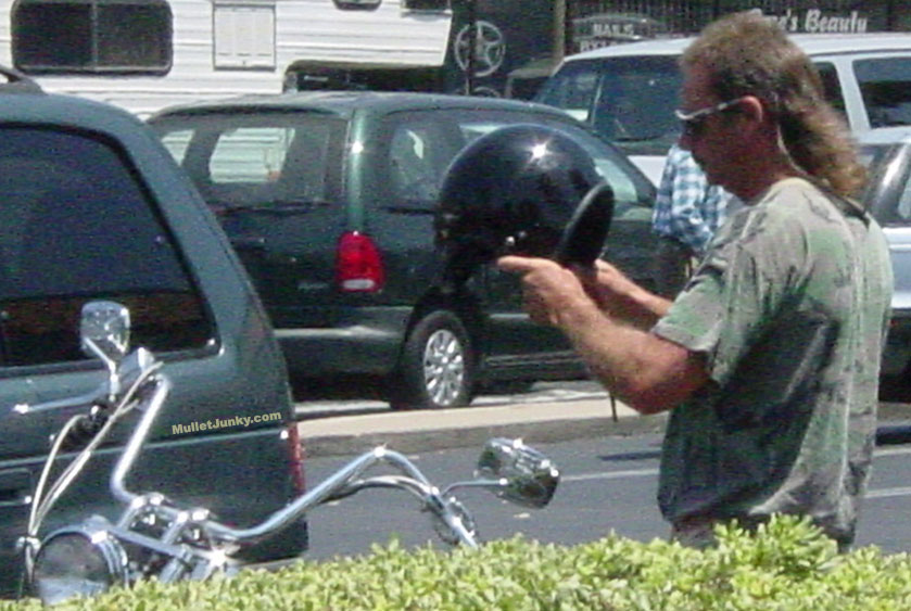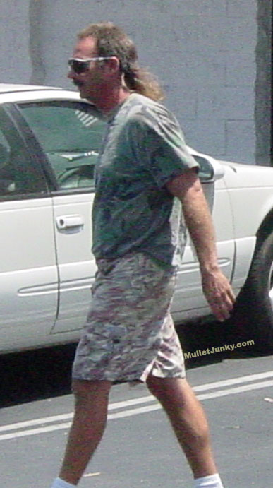 Camouflage shirt, camouflage short pants(slight color variation which makes it even nicer), Oakly sunglasses, Mullestache and a primordial vigorous stride. Why is he so intense in his walk? Because he's gittin' on a motorcycle! "Gonna ride around town on my hog, feel the wind on my face. Hate these damn helmut laws! I got around them laws though, i just keep my hair short on the top and sides where the helmut goes and i let the back grow super long. It looks so sweet when i ride around. It looks like i have a head full of hair because it blows around all crazy from under the back of the helmut. Then i take off my helmut and people cant believe what they see. Some people even take pictures of me, haven't figured that out yet but whatever. Anyway's, if were gonna have these stupid helmut laws i might as well have the perfect haircut to accommodate, or is that accompany, never mind you get the point, right?" shitya |