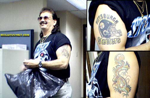There are many Janitor Mullets out there lurking in cubicles near you. However this particular one hunted in Pittsburgh comes with many bonuses: The gapped buck tooth nestled under the thick mullestache. The old lady gradient-purple-fade-to-clear sunglasses. Plenty of fake gold chains, and finally the rolled sleeve unveils his masterpiece tattoos. His favorite football team and a dragon. 2 tattoos that everyone should have, really. If you don't want a dragon, get a dagger with a snake wrapped around it. It'll make you really hard. While this particular specimen of janitor mullet was found in Pittsburgh, be assured that others may be found in office cleaning positions from New York to Los Angeles. |